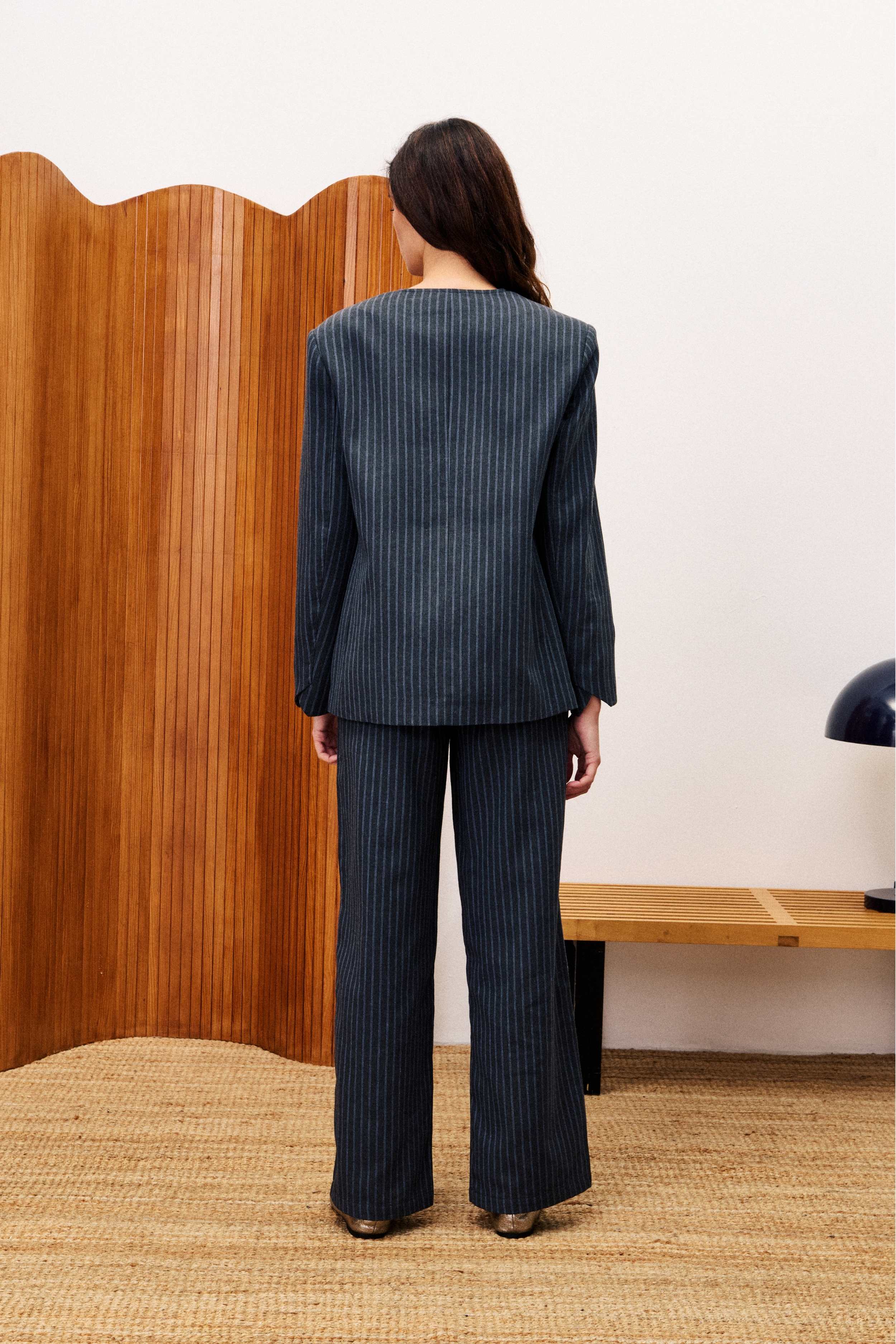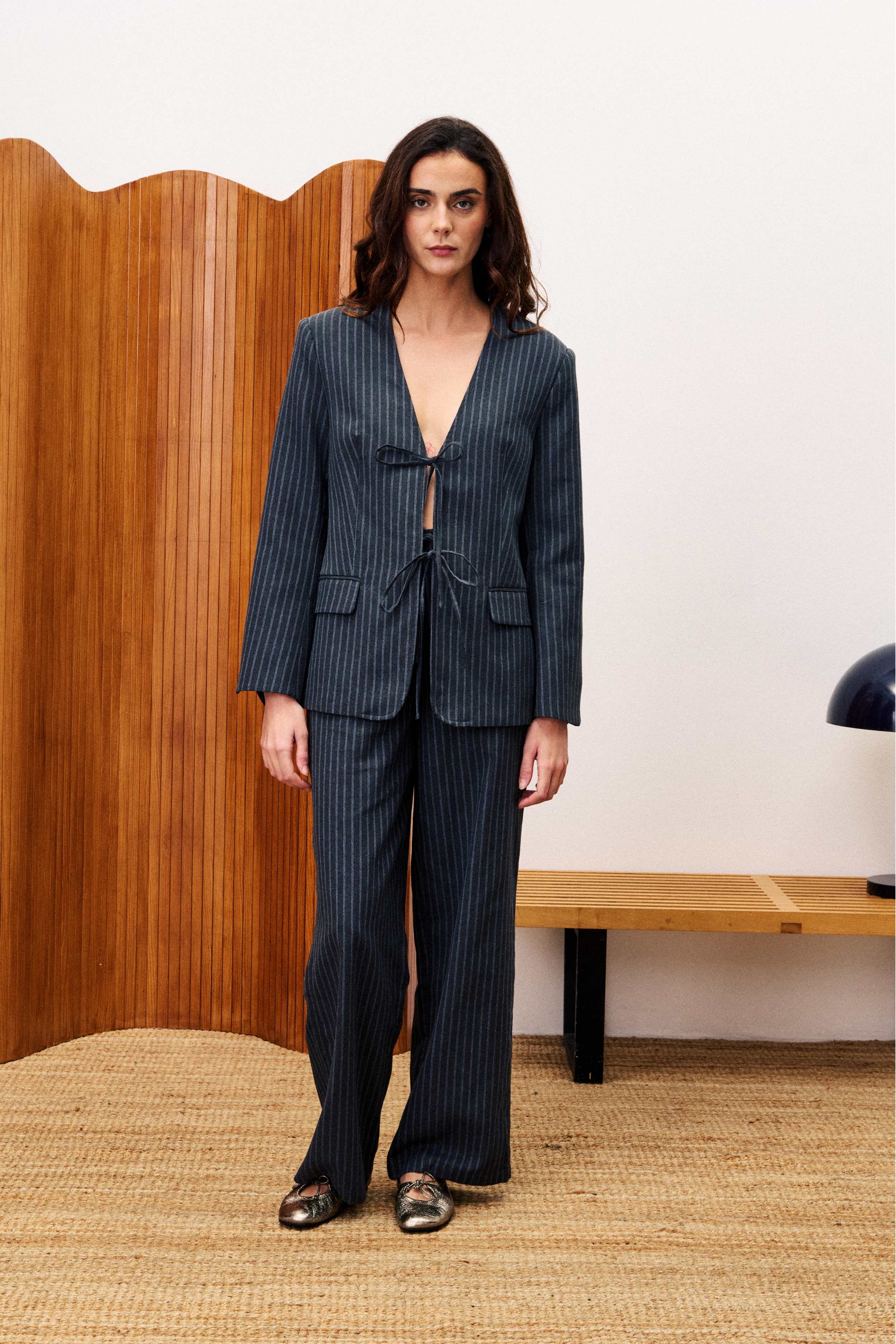 La Blazer Grisette de la marca Frnch, equilibra líneas masculinas y un fit favorecedor. Estructura que estiliza los hombros, con un toque original en la parte delantera, las lazadas. La textura sastrera añade carácter y sofisticación.