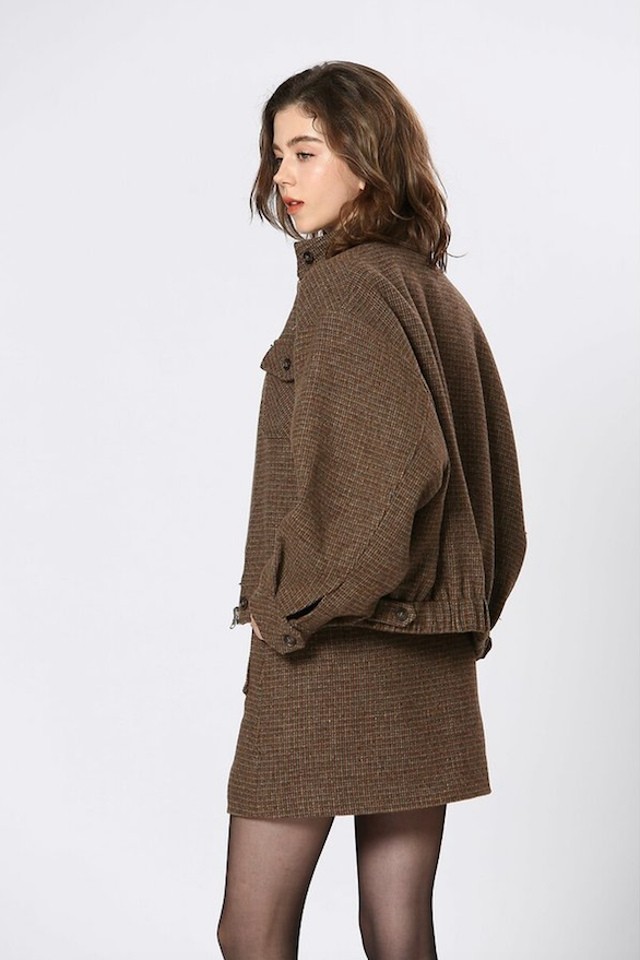 El corte de la chaqueta corta con cremallera de la marca See u Soon, es boyfrend, estilo oversize. Con un patrón ancho.