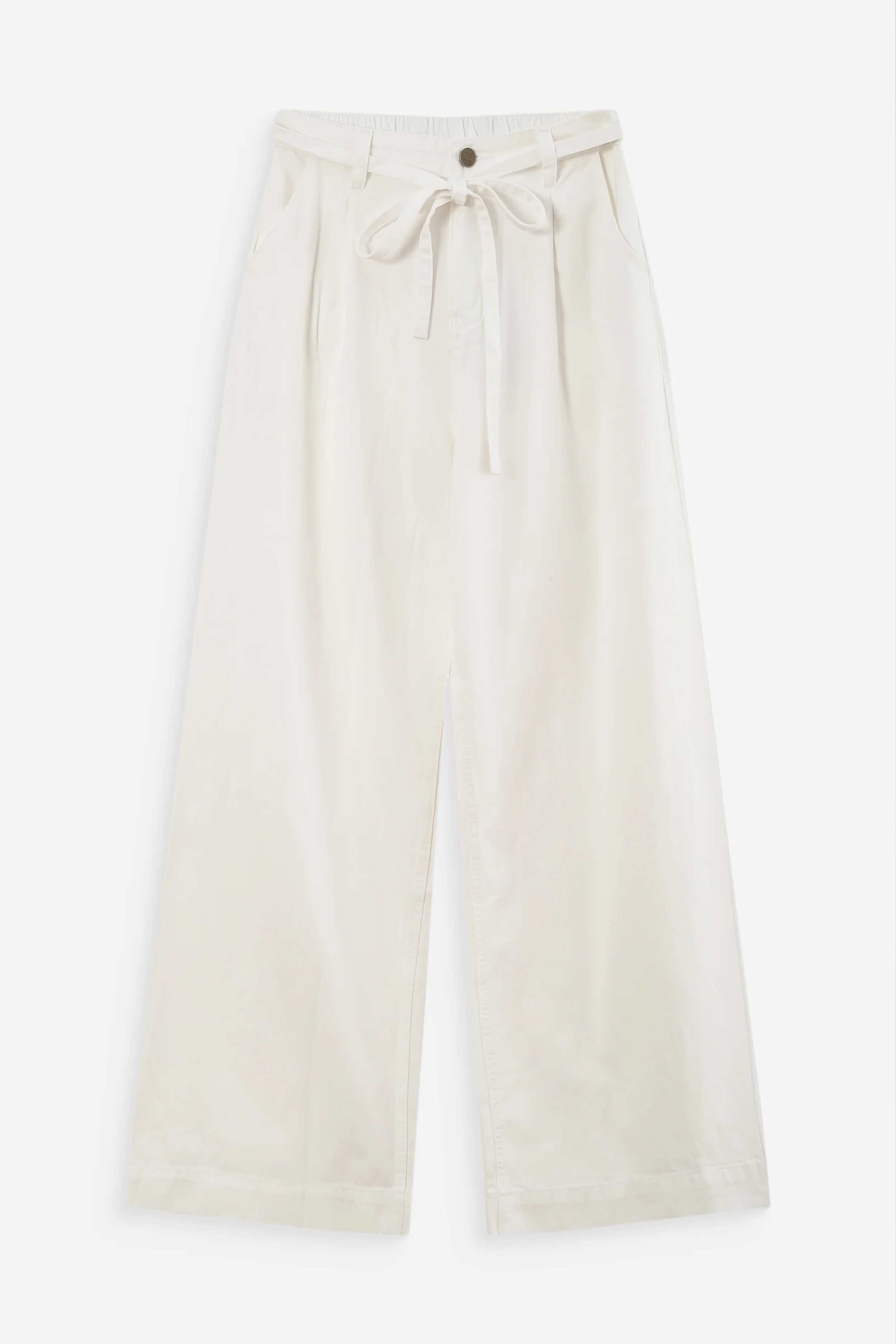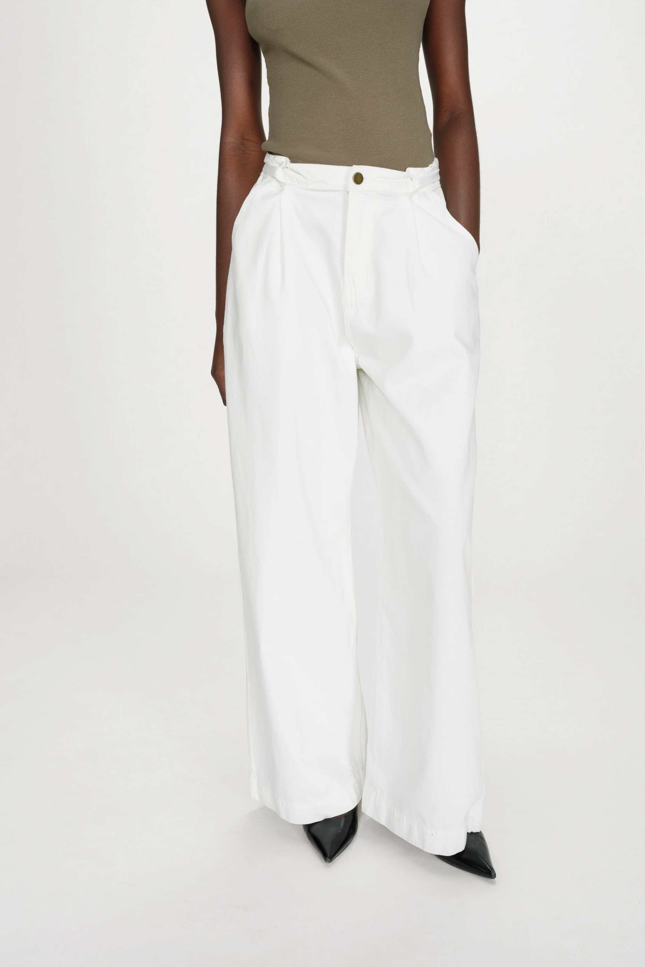 El pantalón Pompon holgado en color blanco de la marca francesa Grace and Mila, son rectos y holgados. La cintura de tiro medio y con pliegues en la cinturilla delantera. Con trabillas con cinturón extraíble a juego. La bragueta con cremallera y botón metálico monograma.